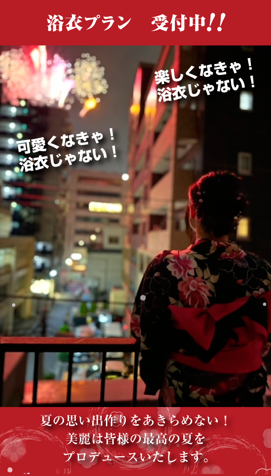 浴衣レンタル・着付け料込。小物、下着、下駄、髪飾り無料貸出!